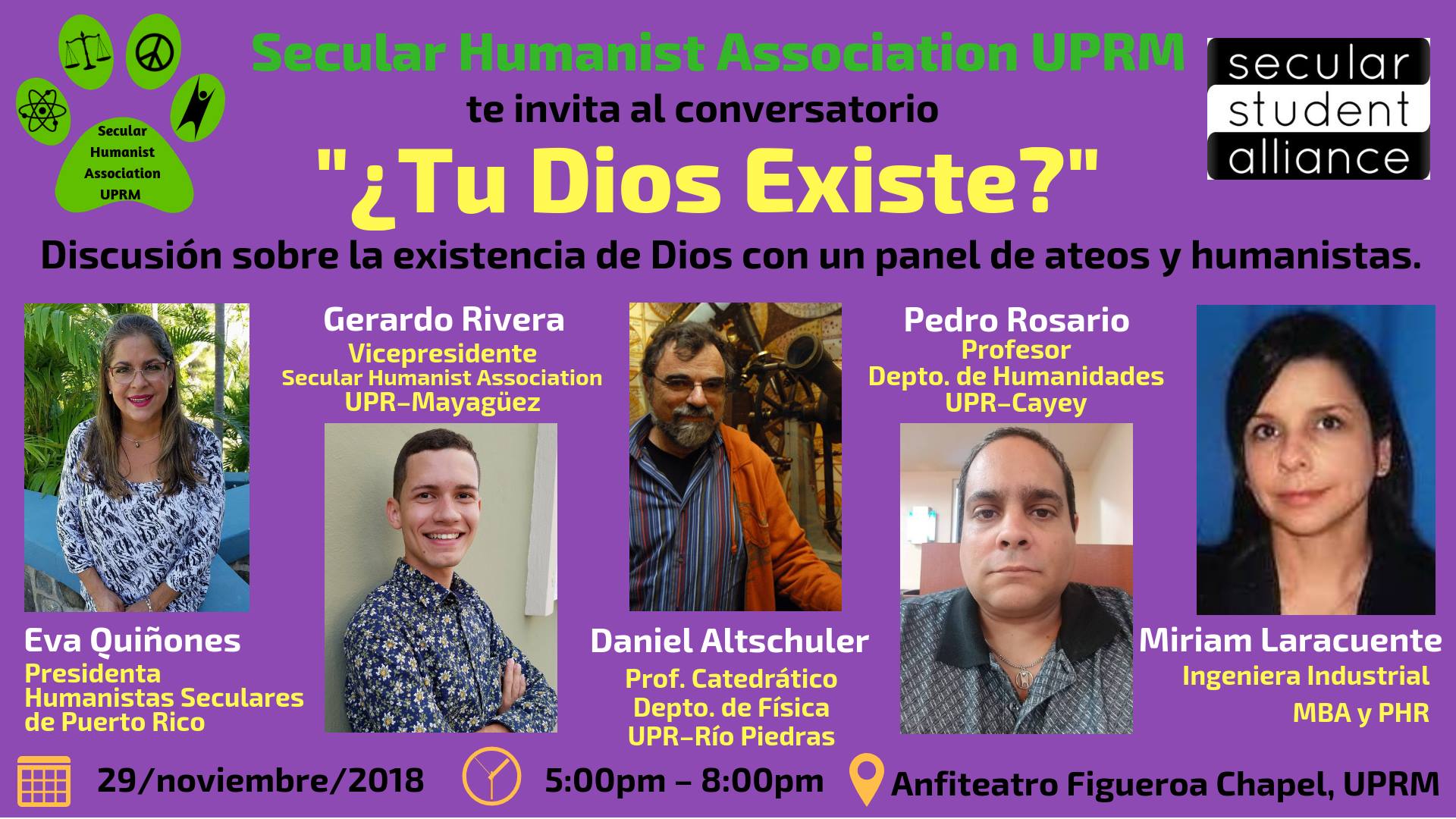 En el conversatorio, se nos harán preguntas en relación con temas afines al ateísmo,, agnosticismo y humanismo. Ven y visítanos a las 5:00pm en el Anfiteatro Figueroa Chapel, de la Universidad de Puerto Rico, Recinto de Mayagüez. Invita la Secular Humanist Association de UPR Mayagüez, miembro de la Secular Student Alliance.