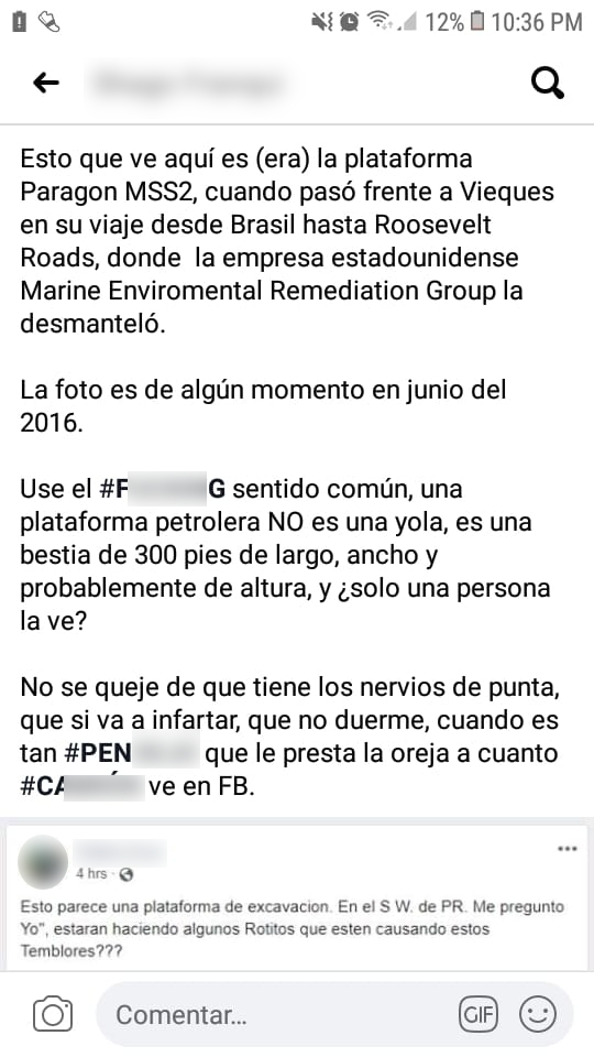 Finalmente, están los que circulan cierta información en torno a una publicación del 2013 del U.S. Geological Survey, donde se establece un potencial de que exista petróleo y gas en los alrededores de Puerto Rico. En la mente de muchos, los temblores se deben a exploración y extracción de petróleo o gas debido a fracturación hidráulica o fracking. Estas entradas a Facebook se dieron en un grupo dado “DANDO FUETE A LA CORRUPCIÓN”. He aquí algunas de las imágenes que han estado circulando en las redes sociales (he borrado los nombres para evitar doxxing):